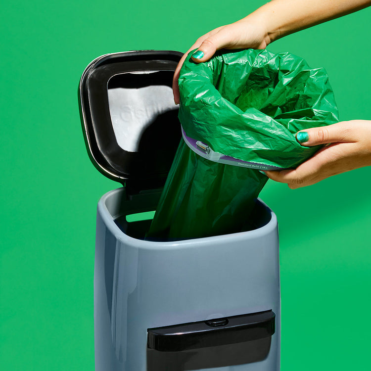 - EASY TO USENo more cutting or tying knots! Use with an old Litter Genie refill cartridge. Simply open bag, wrap opening around the cartridge and insert into the pail (see illustration). Change as needed. Opaque color conceals contents. IMPORTANT: Store in a cool, dry & dark place (not in a humid bathroom) to protect the integrity of the bags.