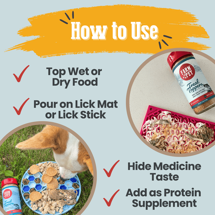 Incorporating food toppers into your pet's daily diet is a cinch with Farm to Pet Treat Toppers! Thanks to a break-resistant jar and a convenient shake-or-spoon top, it's easy to sprinkle this protein powder for pets over wet food or dry kibble, pour on top of a lick mat recipe, or mix into broths, homemade pet treats and even medicines. Fish Treat Topper is also a great food topper for senior dogs and puppies who may need higher protein intake. No matter how you choose to use our healthy pet food toppers, fur babies get an instant boost of flavor and nutrition every time!