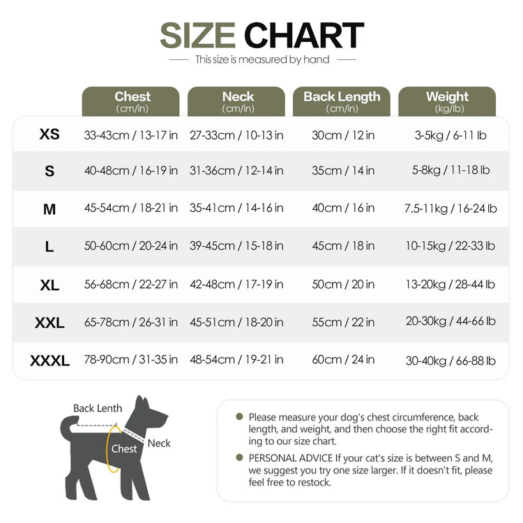 Available in sizes XS through XXXL. Measure your dog’s chest, neck, and back length before selecting a size. If between sizes, choose the larger option for a more comfortable fit.